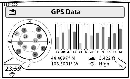 4. | Sélectionnez GPS. Le système affiche les coordonnées, l'altitude, le signal et les informations de position. Consultez Figure 1.. |