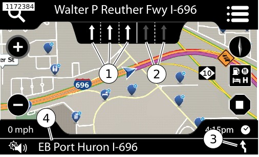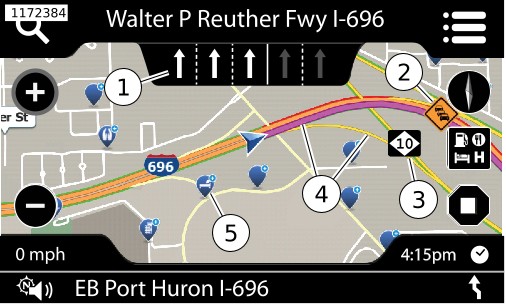5. | Sélectionnez Zoom. La carte montre la manœuvre avec des détails sur le bas de l’écran. | |