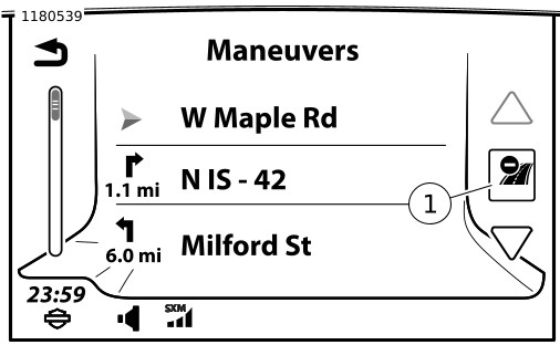 8. | Sélectionnez : a. Retourner d’un écran : Cela ramène le motocycliste à la liste des manœuvres. b. Retourner de deux écrans : Cela ramène le motocycliste à la carte. |