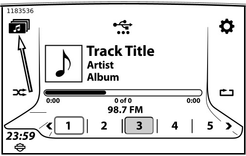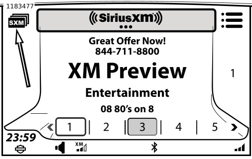Figure 4.. L’icône SiriusXM (SXM) ouvre une liste de catégories qui est sélectionnable par genre, artiste ou une chanson.