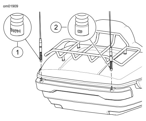 Figure 1.. L’antenne à l’arrière du véhicule peut être retirée pendant l’entreposage. S’assurer de poser l’antenne avant d’utiliser la radio. Pour réaliser la pose, visser manuellement l’antenne à son support. Les antennes du tuner et de la CB sont différentes. Pour les véhicules équipés d’une CB, il faut toujours poser l’antenne CB (signalée par les lettres « CB » à la base du mât) sur le côté droit de la motocyclette. L’antenne marqué « AM/FM » est pour la réception du tuner. La pose de la mauvaise antenne pour le tuner et la CB entraîne une réception dégradée.