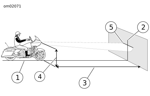 모터사이클에 하중을 실은 상태에서 프론트 휠이 벽을 똑바로 가리키도록 합니다. 바닥에서 전조등 표면 중심까지 거리(4)를 측정합니다.