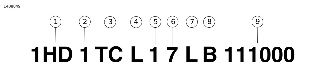 1 | Dünya imalatçı tanıtıcısı | 1HD=Aslen ABD’de üretilmiştir 5HD=Aslen Amerika Birleşik Devletleri’nde veya Tayland’da yurt dışına satışlar için üretilmiştir 932=Aslen Brezilya’da üretilmiştir MEG=Aslen Hindistan’da üretilmiştir MLY=Aslen Tayland’da üretilmiştir | |