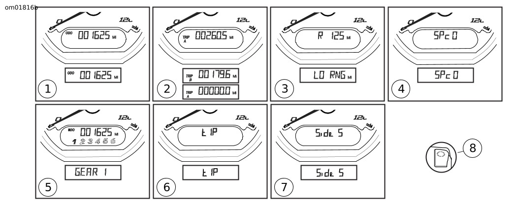 Pav 1. Odometras rodo bendrąją motociklo ridą. Paspauskite įjungimo jungiklį, kad perjungtumėte skirtingas odometro funkcijas. Laikas ir odometras gali būti rodomi paspaudus įjungimo jungiklį, kai motociklas išjungtas.