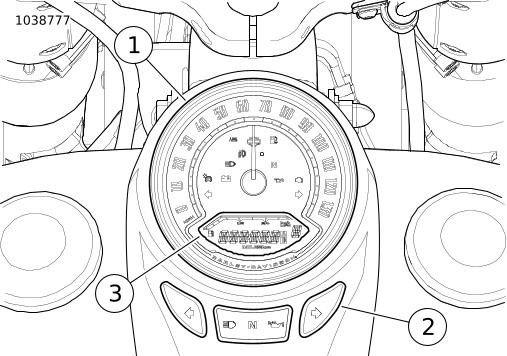 当前挡位(1-6)在里程表旁边显示。 在摩托车未行进、变速箱处于空挡或者拉回离合器手杆时,挡位不显示。