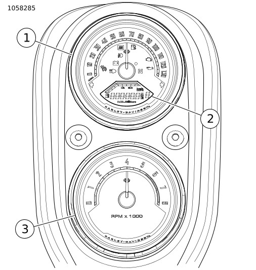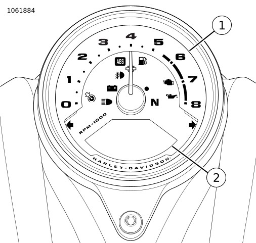 图6。 短按短途旅行开关可循环显示里程表窗口各内容。 里程表显示发动机转速,单位为每分钟转数(RPM)。
