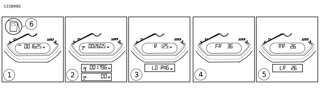 Figur 1. Trippmätaren visar motorcykelns sammanlagda körsträcka. Tryck på aktiveringskontakten för att växla mellan trippmätarens olika funktioner. Trippmätaren kan visas när motorn är avstängd genom att trycka på aktiveringskontakten.