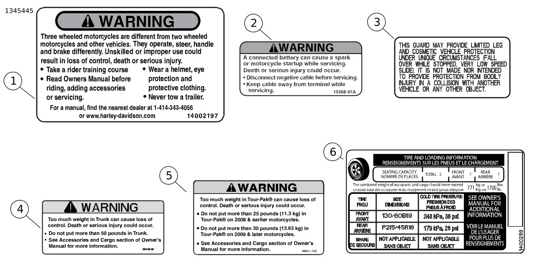 1 | 14002197 | Allmänna varningar | Ovanpå luftrenarens kåpa | VARNING: Trehjuliga motorcyklar skiljer sig från tvåhjuliga motorcyklar och andra fordon. De hanteras, styrs, uppträder och bromsar på ett speciellt sätt. Om den används på ett felaktigt sätt kan det lätt leda till att föraren tappar kontrollen över fordonet, vilket kan leda till dödsfall eller allvarliga personskador.