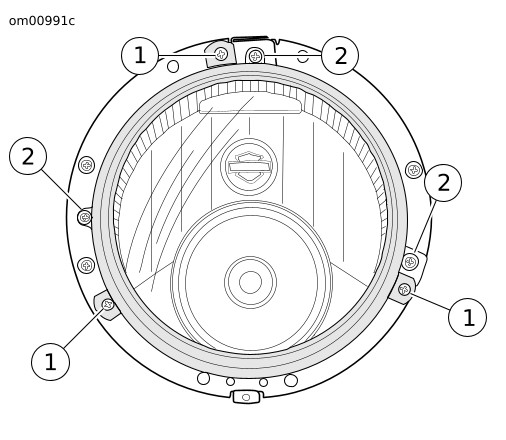 | 2. | Ασφαλίστε τη διάταξη προβολέα με τον δακτύλιο συγκράτησης και τις βίδες (1). Σφίξτε μέχρι 2,6–2,9 N·m (23–26 in-lbs). | |