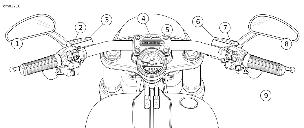 Εξοικειωθείτε με τις θέσεις όλων των χειριστηρίων λειτουργιών και συντήρησης της μοτοσικλέτας σας.