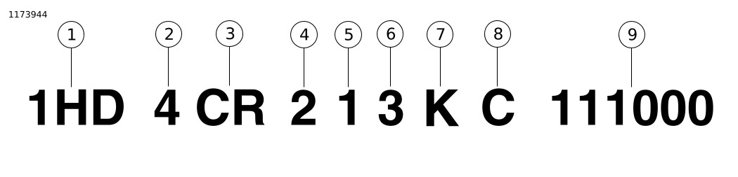 1  | Kode pengenal produsen internasional  | 1HD=Diproduksi di Amerika Serikat 5HD=diproduksi di Amerika Serikat untuk dijual di luar Amerika Serikat 932=Diproduksi di Brazil MEG=Diproduksi di India MLY=Diproduksi di Thailand  | |