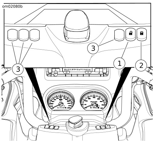 Gambar 1. Panel untuk sakelar aksesori berada pada tutup fairing. Sakelar untuk aksesori terpasang dapat ditambahkan. Beban maksimum per sakelar adalah 2 A.