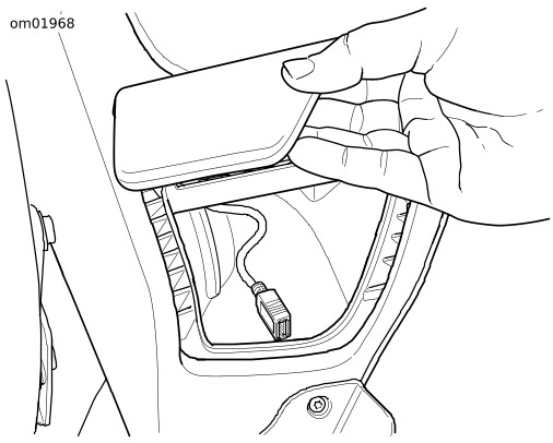 Gambar 1. Kompartemen media di sisi kanan fairing memiliki port USB untuk menyambung dengan telepon, perangkat media, atau drive USB. Port USB berisi daya dan dapat beroperasi saat sepeda motor dihidupkan atau berada dalam mode aksesori. Kabel penghubung mungkin diperlukan untuk menyambungkan perangkat tertentu. Lihat MANUAL PEMILIK BOOM! BOX.