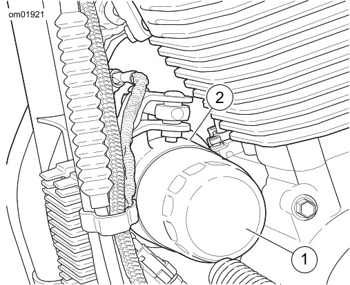 PEMBERITAHUAN Gunakan kunci pas filter oli Harley-Davidson untuk melepas filter. Alat ini dapat mencegah kerusakan pada sensor posisi poros engkol dan/atau kabel sensor. (00192b) | ||