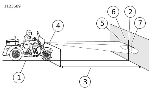 | 8. | Gambar target di dinding. a. Gambar garis horizontal (5) pada ketinggian garis tengah sorot dekat. b. Ukur jarak dari garis tengah kendaraan ke garis tengah vertikal setiap lampu depan. c. Gambar garis vertikal (6, 7) pada garis tengah lampu depan. | |