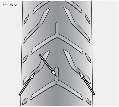Segera ganti ban dengan yang ditentukan oleh Harley-Davidson saat baris keausan menjadi terlihat jelas atau hanya tersisa kembang ban sedalam 1 mm (1/32 in). Berkendara dengan ban yang aus dapat menyebabkan kematian atau cedera parah. (00090c)