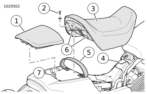 | 1. | Lihat Gambar 2. Lepas jok penumpang (1). a. Angkat bagian belakang jok penumpang untuk melepaskannya dari batang penahan (7). b. Geser jok penumpang ke arah belakang untuk melepaskannya. | |