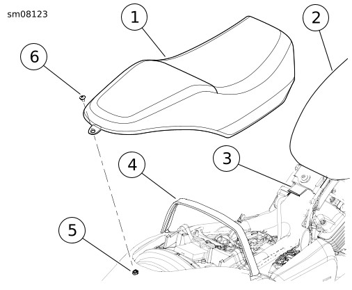 | 3. | Pasang sekrup penahan jok (6). Torque: 2,3–4,5 N·m (20–40 in-lbs) Sekrup penahan jok |