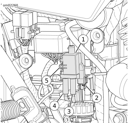 | 11. | Hanya untuk model California, Asia-Pasifik, Inggris, HDI, dan India: Lihat Gambar 1. Pasang solenoid pembuangan. a. Pasang solenoid pembuangan (1). b. Pasang modul solenoid-ke-induksi dan selang canister-ke-solenoid (3 dan 4). c. Sambungkan konektor solenoid pembuangan (2). | |
