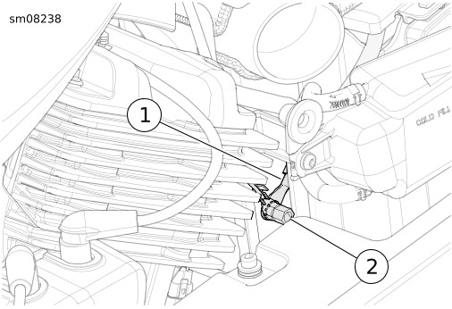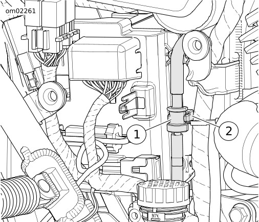 | 5. | Lihat Gambar 5. Sambungkan kabel baterai negatif (1) ke baut tanam gron (2). Torque: 6–7,5 N·m (54–66 in-lbs) Baut tanam pengardean | |