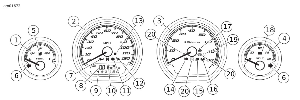 Figur 2. Speedometeret viser hastigheten forover i miles per time (USA-modeller) eller kilometer per time (internasjonale modeller).