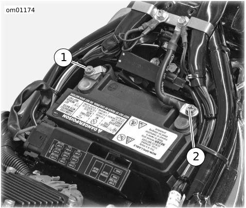 HINWEIS Die Batterie sauber halten und eine dünne Schicht Vaseline auf die Pole auftragen, um Korrosion zu verhindern. Bei Nichtbefolgen dieser Anleitung können die Batteriepole beschädigt werden. (00217a) | ||