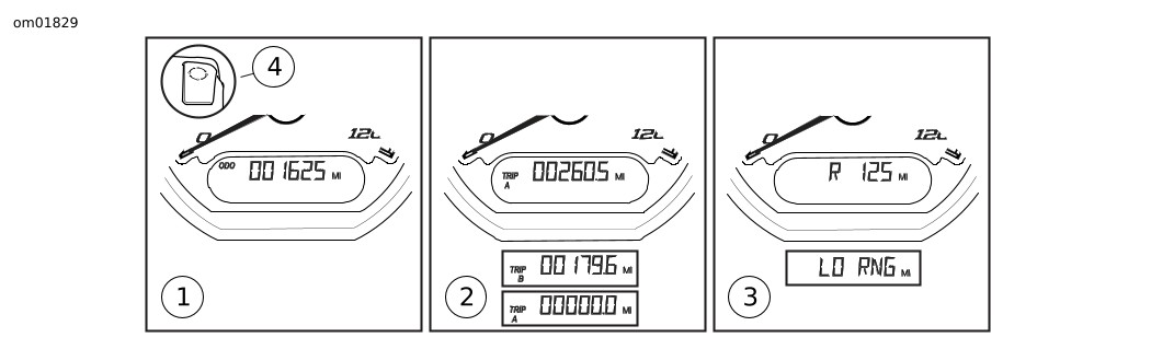 المواصفات → المواصفات → السعات. يتم عرض نطاق الوقود تلقائيًا في نافذة عداد المسافة عند إضاءة لمبة انخفاض الوقود. عند انخفاض نطاق الوقود إلى 10 أميال أو 10 كيلومترات متبقية، تعرض شاشة عداد المسافة "LO RNG" للإشارة إلى اقتراب نفاد الوقود من الدراجة النارية. تزود بالوقود في أقرب وقت ممكن.