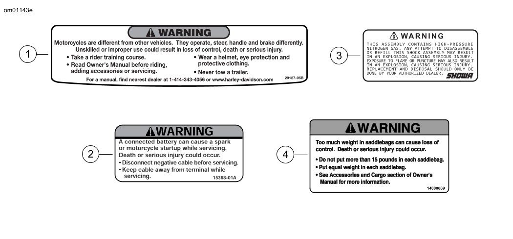 4 | 14000069 | Belastningsgrænse for sadeltaske | Inde i sadeltaske (på modeller, som har det udstyr) | ADVARSEL: For meget vægt i sadeltasker kan føre til, at du mister herredømmet. Det kan resultere i dødsfald eller alvorlig personskade.