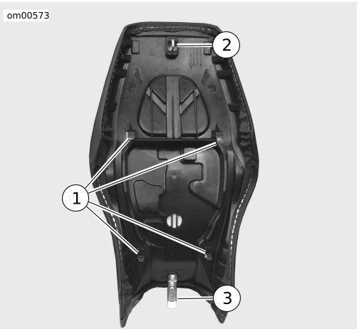 Après avoir posé la selle, essayer de la soulever afin de vérifier qu'elle est verrouillée en position. Pendant la conduite, une selle mal fixée risque de bouger et de provoquer une perte de contrôle, pouvant entraîner la mort ou des blessures graves. (00070b) | ||