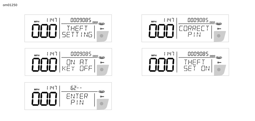 Zobacz Rysunek 5. Naciśnij włącznik trybów, aby przejść do pozycji menu THEFT SETTING (ustawianie zabezpieczenia przd kradzieżą). Naciśnij wyłącznik przełączania, aby wybrać tę funkcję.